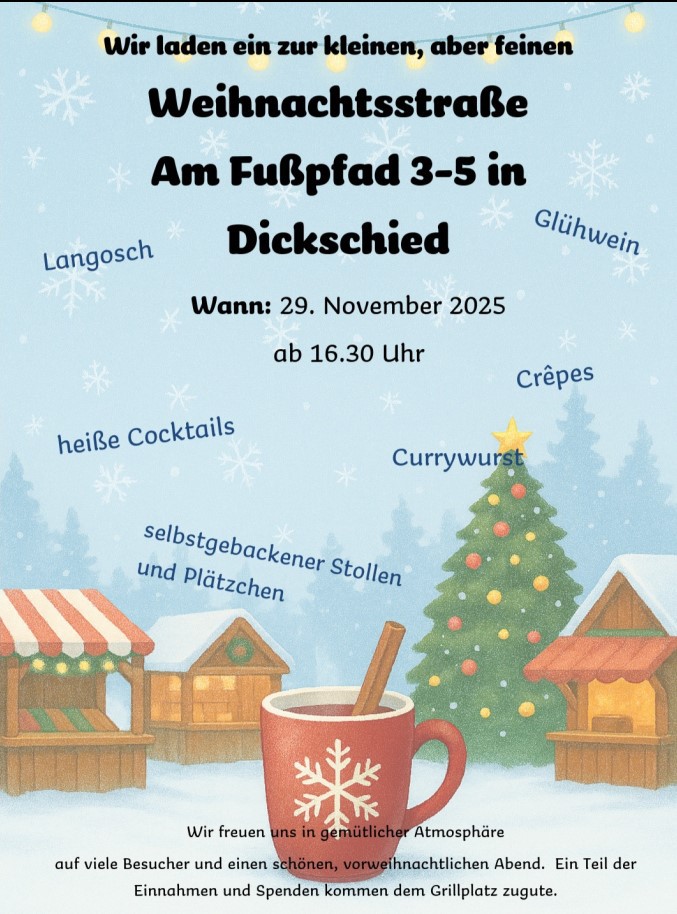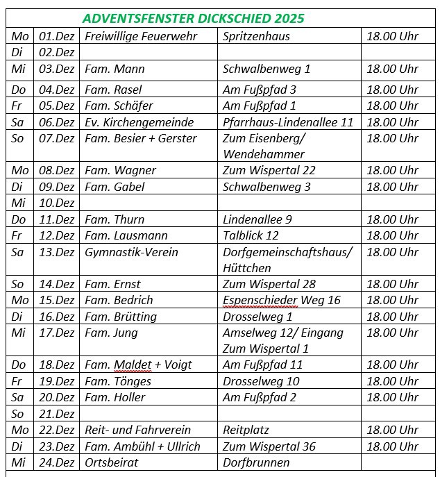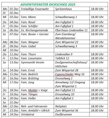 Das sind weihnachtlich geschmückte Fenster in Dickschied, an denen sich alle Dickschieder treffen können, die Lust und Zeit haben, abends ab 18.00 Uhr bei einem warmen Getränk gemütlich zusammen zu sein.