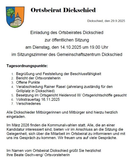 Die Sitzungen des Ortsbeirates sind öffentlich. Alle interessierten Dickschieder Bürger/-innen sind herzlich eingeladen an den Sitzungen teil zu nehmen.